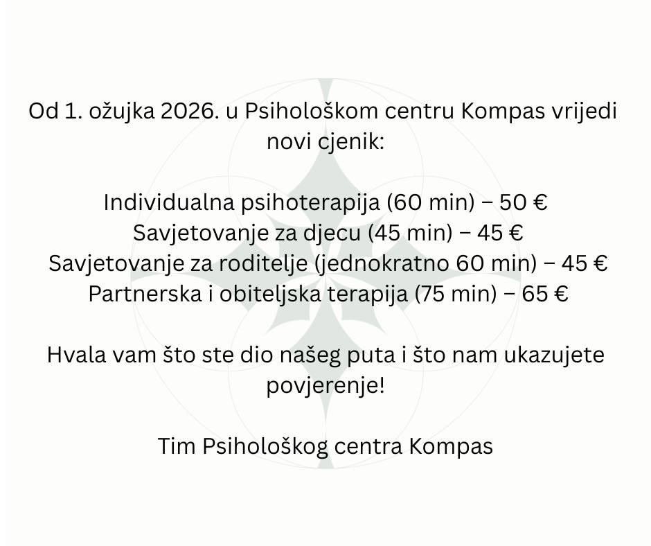 želimo vas obavijestiti da od 1. ožujka 2026. godine dolazi do promjene cjenika usluga u Psihološkom centru Kompas.